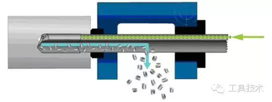 槍鉆(見圖1)的鉆柄是空的,由內(nèi)外部供應(yīng)的切削液流經(jīng)鉆頭內(nèi)輸送管,并強(qiáng)行流經(jīng)切削頭內(nèi)的孔。鉆柄外側(cè)有一個(gè)沿著長(zhǎng)度方向的V形槽,切削液攜帶切屑通過此V形槽,并經(jīng)過鉆頭外側(cè),最終切屑從孔中排出。槍鉆可應(yīng)用于普通加工中心,但是需要高壓力的切削液。