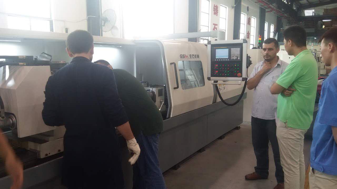 我司開始從機(jī)床的設(shè)計(jì)、嚴(yán)謹(jǐn)?shù)难b配工藝,設(shè)備的零件生產(chǎn)、外觀,我們都謹(jǐn)慎對待一絲不茍。客戶在我公司外貿(mào)部領(lǐng)導(dǎo)的陪同下,詳細(xì)參觀了我公司裝配線,并親自操作試用了機(jī)床。