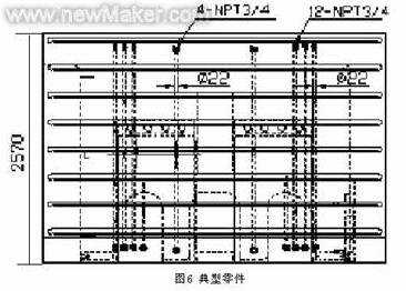例1:一典型零件(見圖6),有16個(gè)Φ22通孔,長(zhǎng)度達(dá)到2550mm。在沒(méi)有使用槍鉆前,類似的深孔加工將會(huì)耗費(fèi)機(jī)床25天的時(shí)間來(lái)完成,而且質(zhì)量往往得不到保證,現(xiàn)在采用槍鉆后僅用了250小時(shí)就高質(zhì)量的完成了工件上所有深孔的加工,取得了良好的應(yīng)用效果。