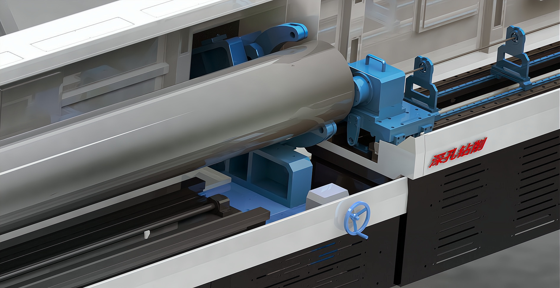 裝夾方式: 液壓卡盤(pán)夾持工件左側(cè)外圓,液壓中心架支撐工件右側(cè)外圓,配置腳踩開(kāi)關(guān),工件裝夾便捷可靠,自定心精度高。