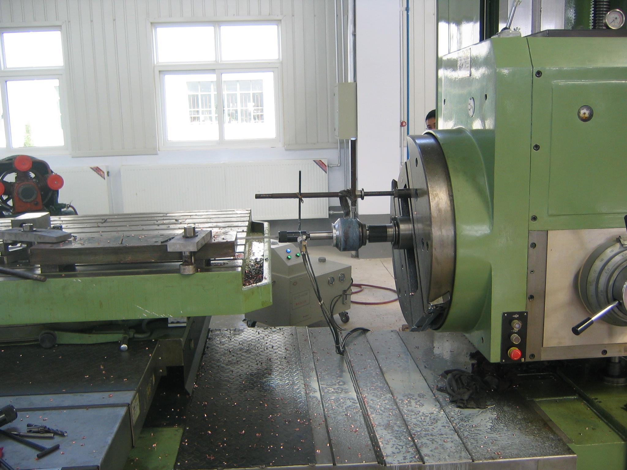 5. 深孔的鉆削:移動(dòng)鏜床主軸或者工作臺(tái),以工件端面對(duì)零,手扶鉆頭進(jìn)入引導(dǎo)孔,止于距孔底1mm處。