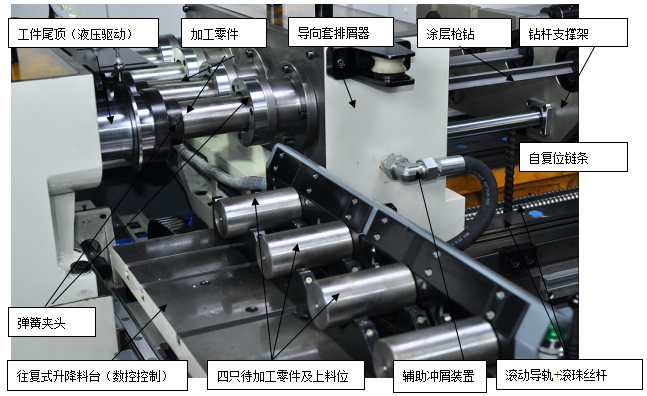 機(jī)床具備四主軸、八工位設(shè)計(jì),工件采用彈簧夾頭通過零件外圓自動(dòng)定位夾緊。機(jī)床配置伺服驅(qū)動(dòng)數(shù)控控制的自動(dòng)往復(fù)升降式上料臺(tái),其料臺(tái)的數(shù)控橫移、升降以及固定的上下料區(qū)域設(shè)計(jì),均可使機(jī)床以極好的適應(yīng)性匹配適宜的如桁架機(jī)械手或六軸機(jī)器人或功能氣缸等自動(dòng)化形式,槍鉆工序的整個(gè)加工過程則在數(shù)控方式下實(shí)現(xiàn)了完全的自動(dòng)化加工。