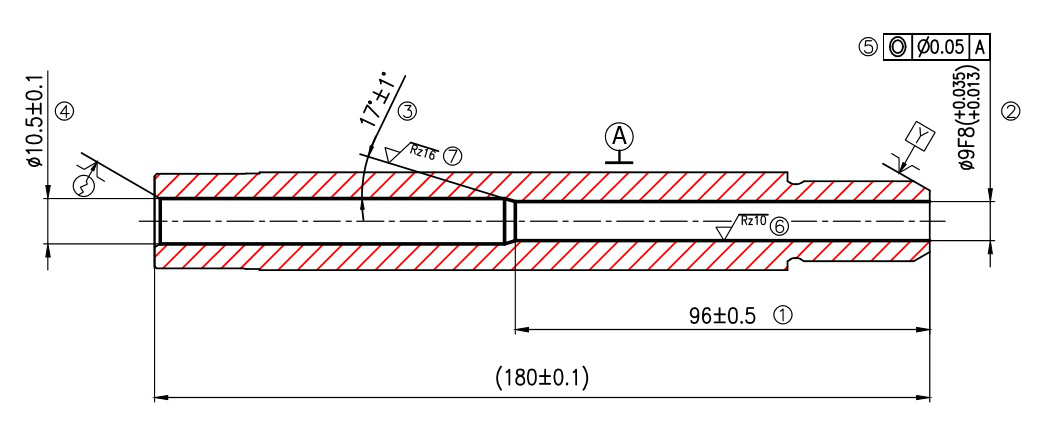 1. φ9F8 (+0.013-0.035),該孔的加工難點(diǎn)在于孔徑公差、孔壁粗糙度和偏斜度的控制。